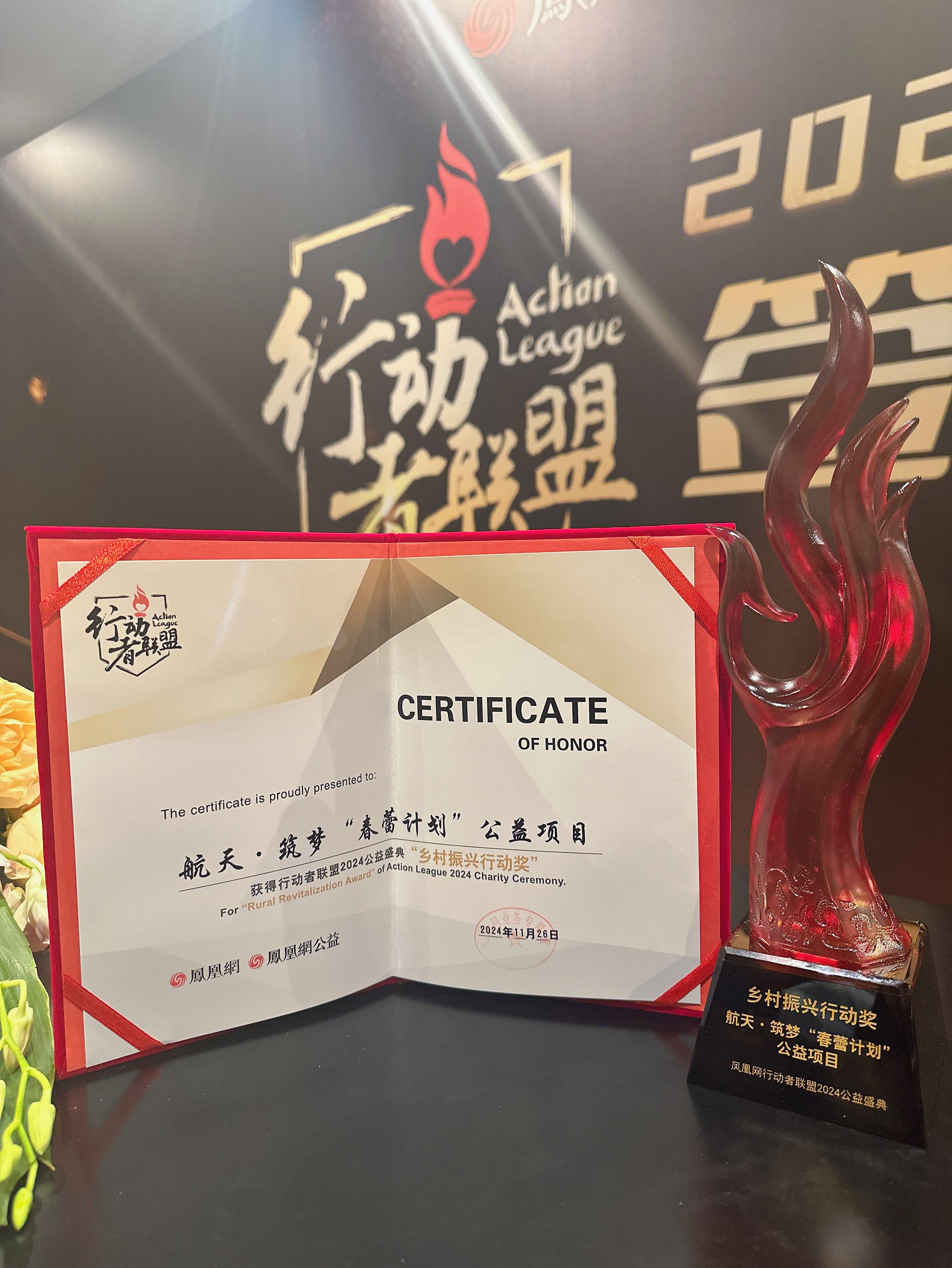 近日,鳳凰網行動者聯盟2024公益盛典在京舉辦,現場揭曉了多個年度公益榮譽。航天·筑夢“春蕾計劃”公益項目榮獲“鄉村振興行動獎”。