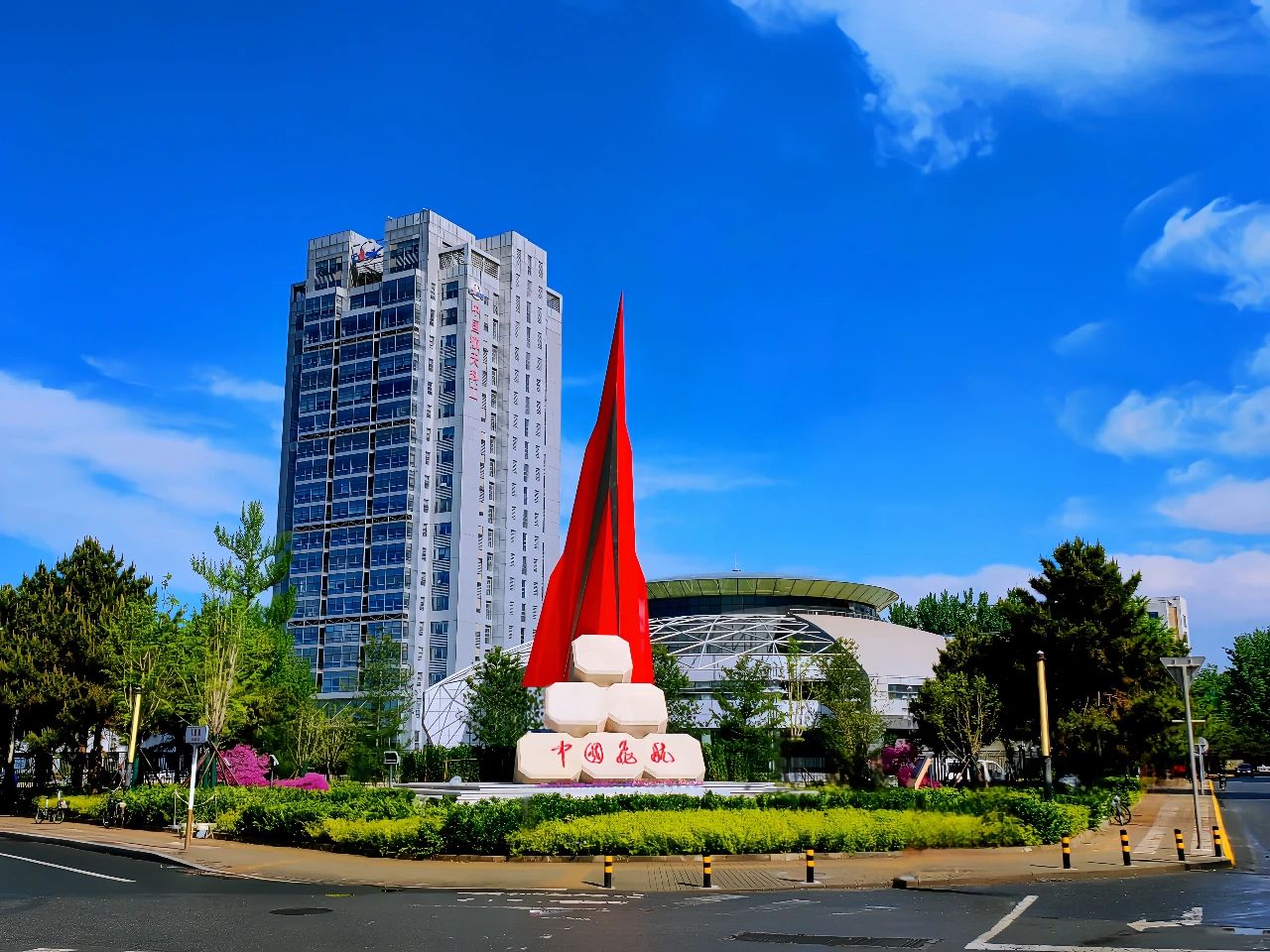 雨后初霽,碧空如洗。在三院辦公樓前廣場東南側,“中國飛航·超越”雕塑巍然聳立,形如未來飛行器,在厚重的石基之上蓄勢待發、昂首蒼穹。