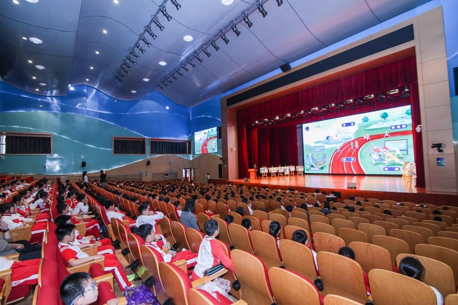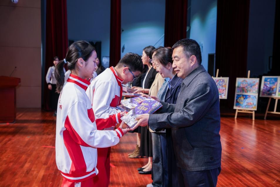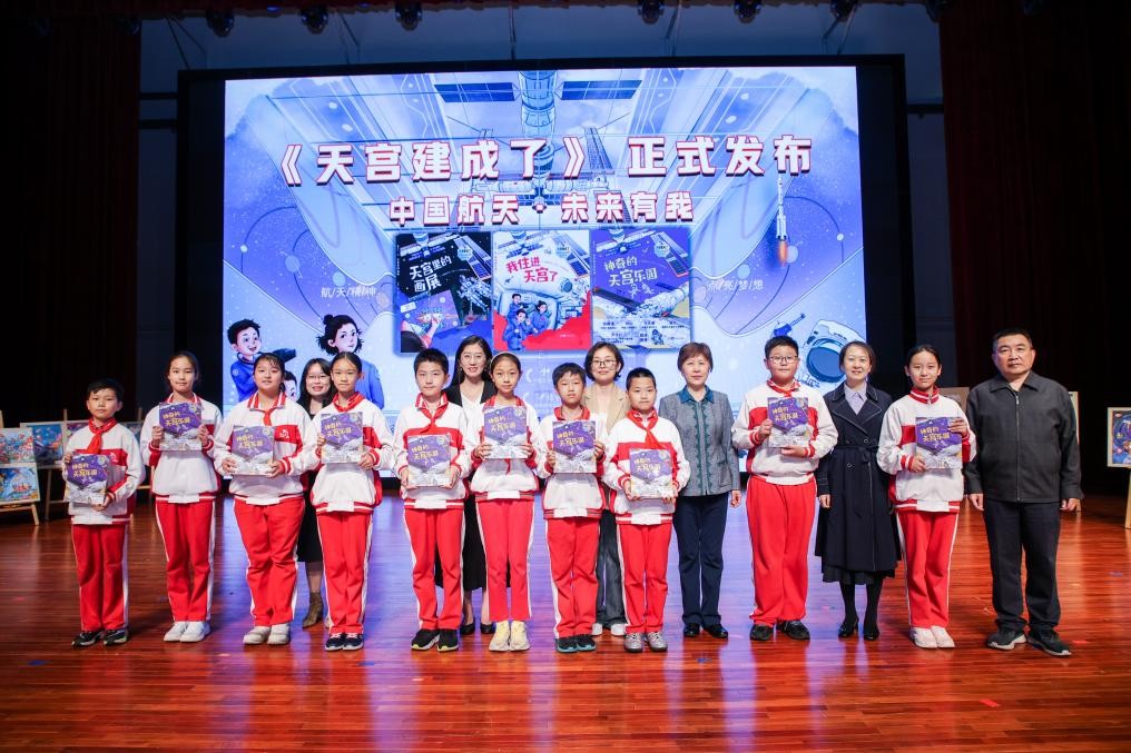 隨后,吳杰、沈立鳳與中國航天科工二院208所二級專務李曉紅共同觸摸啟動球,主視覺大屏同步呈現(xiàn)繪本封面與“天宮建成了”主題字,標志著這套入選“十四五”國家重點出版物出版規(guī)劃項目的科普繪本正式發(fā)布。緊接著的贈書儀式上,與會嘉賓將繪本贈予學生,為育英校園播撒下航天夢想的種子。