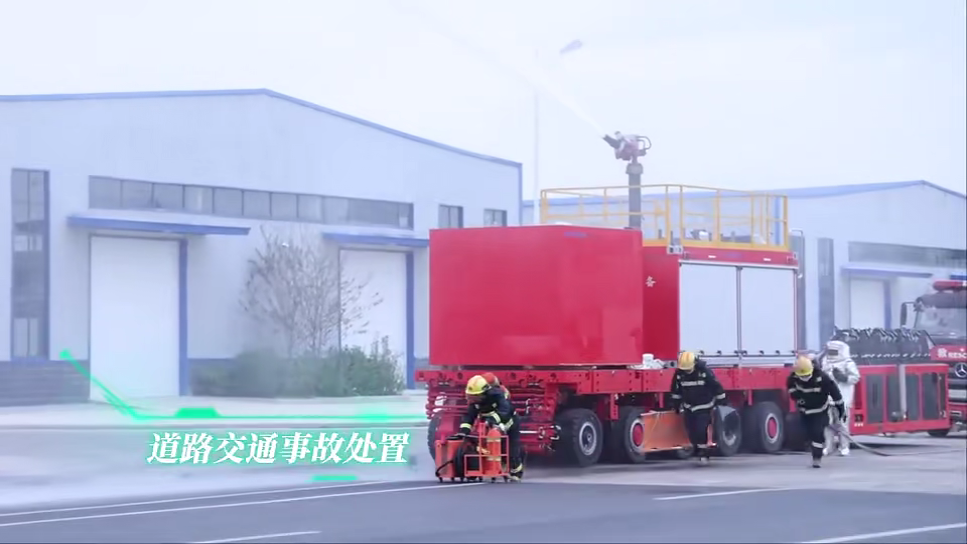 萬向無人消防車由自行式模塊車底盤和智慧消防滅火模塊組成,采用無人遙控方式,可實現多模式靈活轉向、整車整升整降等功能,將泡沫混合液精準噴射到著火點,特別適用于大跨度坍塌、密閉等環境復雜的高危險應用場景。