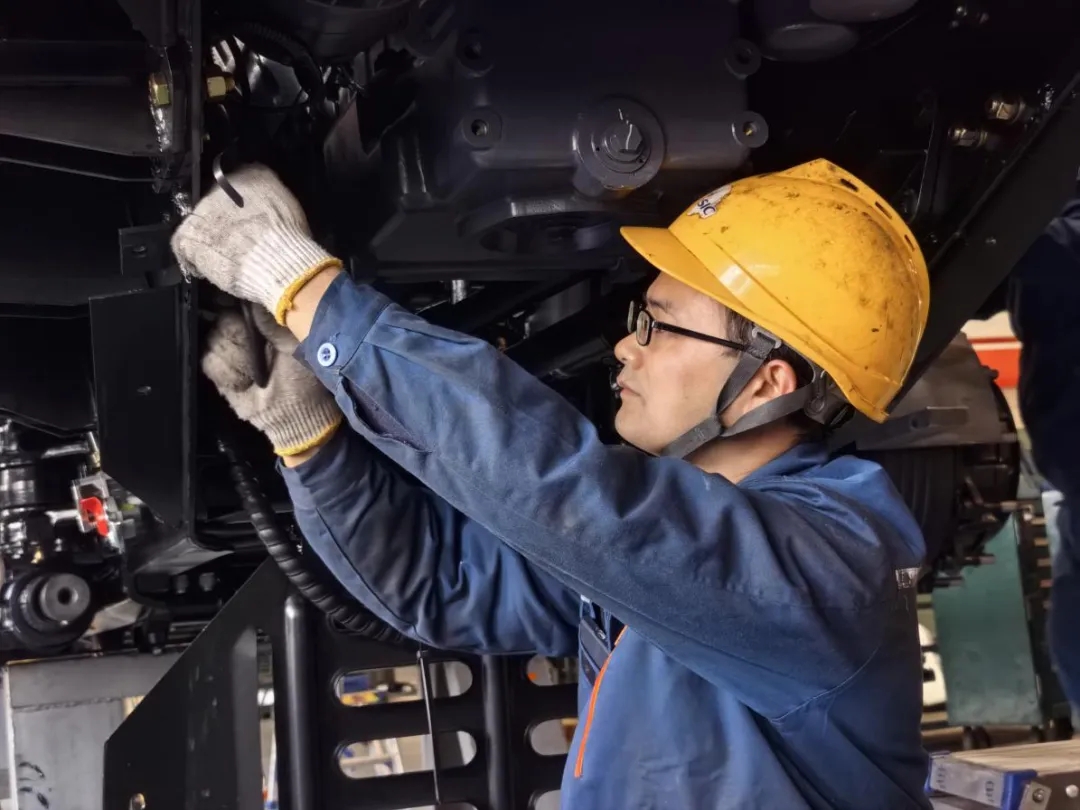 清晨,在三瓦公司生產現場,裝配工正在開展特車底盤質量檢查,他仔細對螺栓扭矩、管路線束、液體加注等關鍵環節逐一核查,不放過任何一處潛在質量隱患,嚴守質量關口,全力保障底盤質量過硬。(圖文/楊毅)