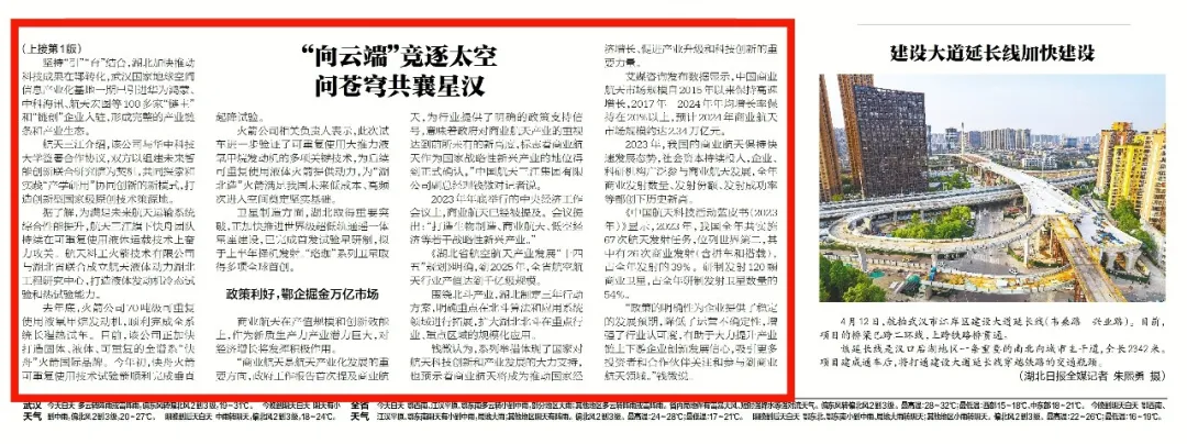 第九個“中國航天日”即將來臨,主題為“極目楚天 共襄星漢”。近日,《湖北日報》推出“商業航天上‘新’記”系列報道,首篇文章以《湖北商業航天“箭”步如飛——“向云端”競逐太空 問蒼穹共襄星漢》為題,聚焦湖北商業航天高質量發展新路徑,重點報道了航天三江快舟系列火箭創新發展,持續發揮航天全產業鏈布局優勢,打造創新型國家級原創技術策源地。