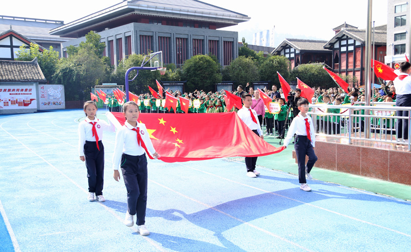 升旗儀式開始前,五星紅旗依次在十院青年代表、文化小學(xué)少先隊員代表手中傳遞,并由少先隊員代表將國旗傳遞至儀仗隊。伴隨著雄壯激昂的國歌,鮮艷的五星紅旗冉冉升起。