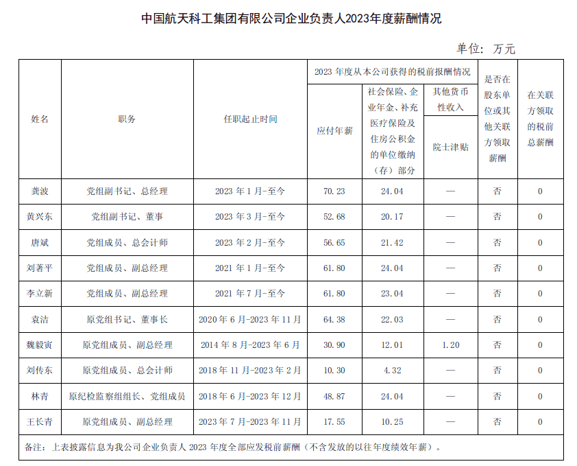 中國航天科工集團有限公司企業負責人2023年度薪酬情況